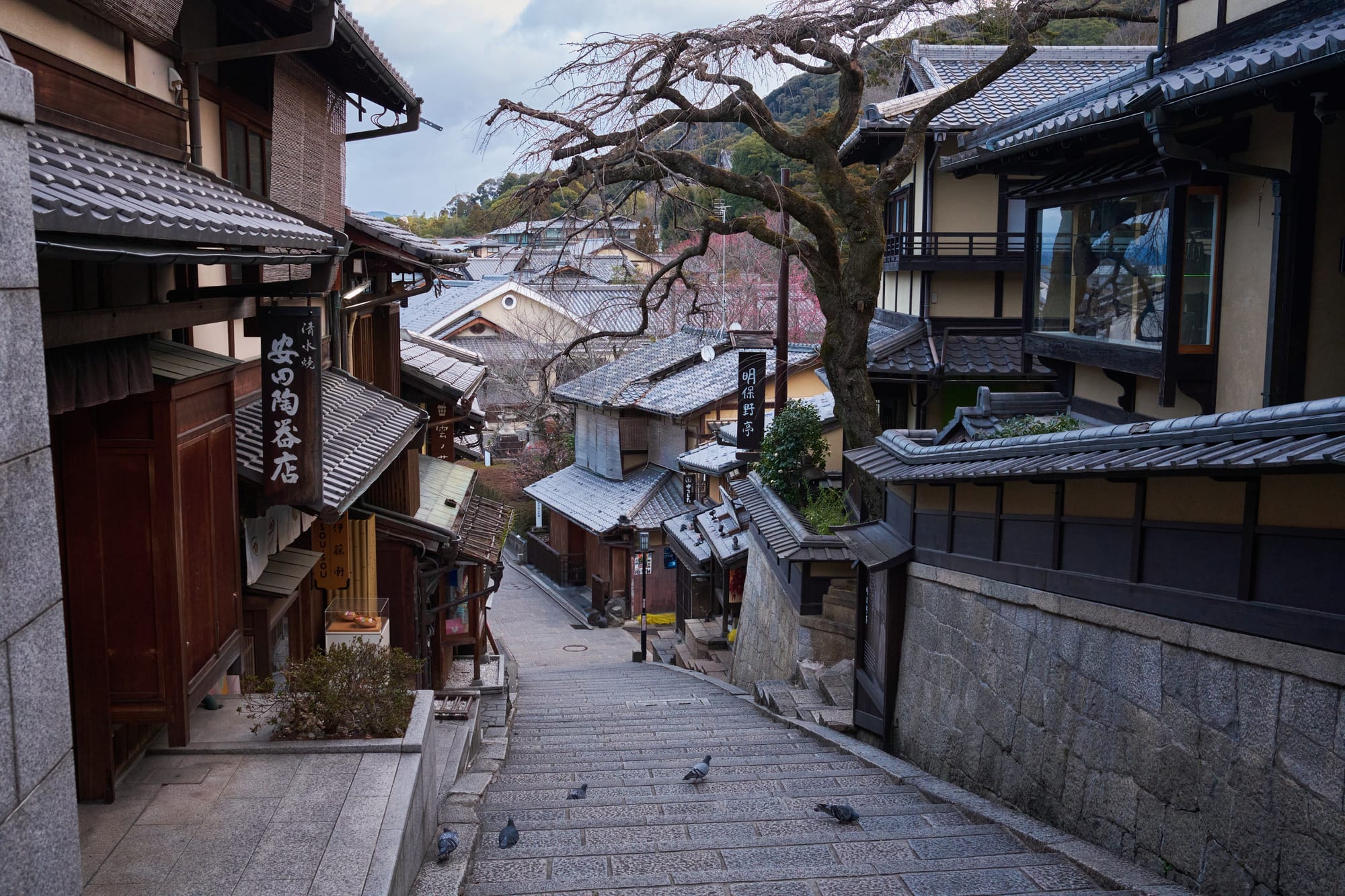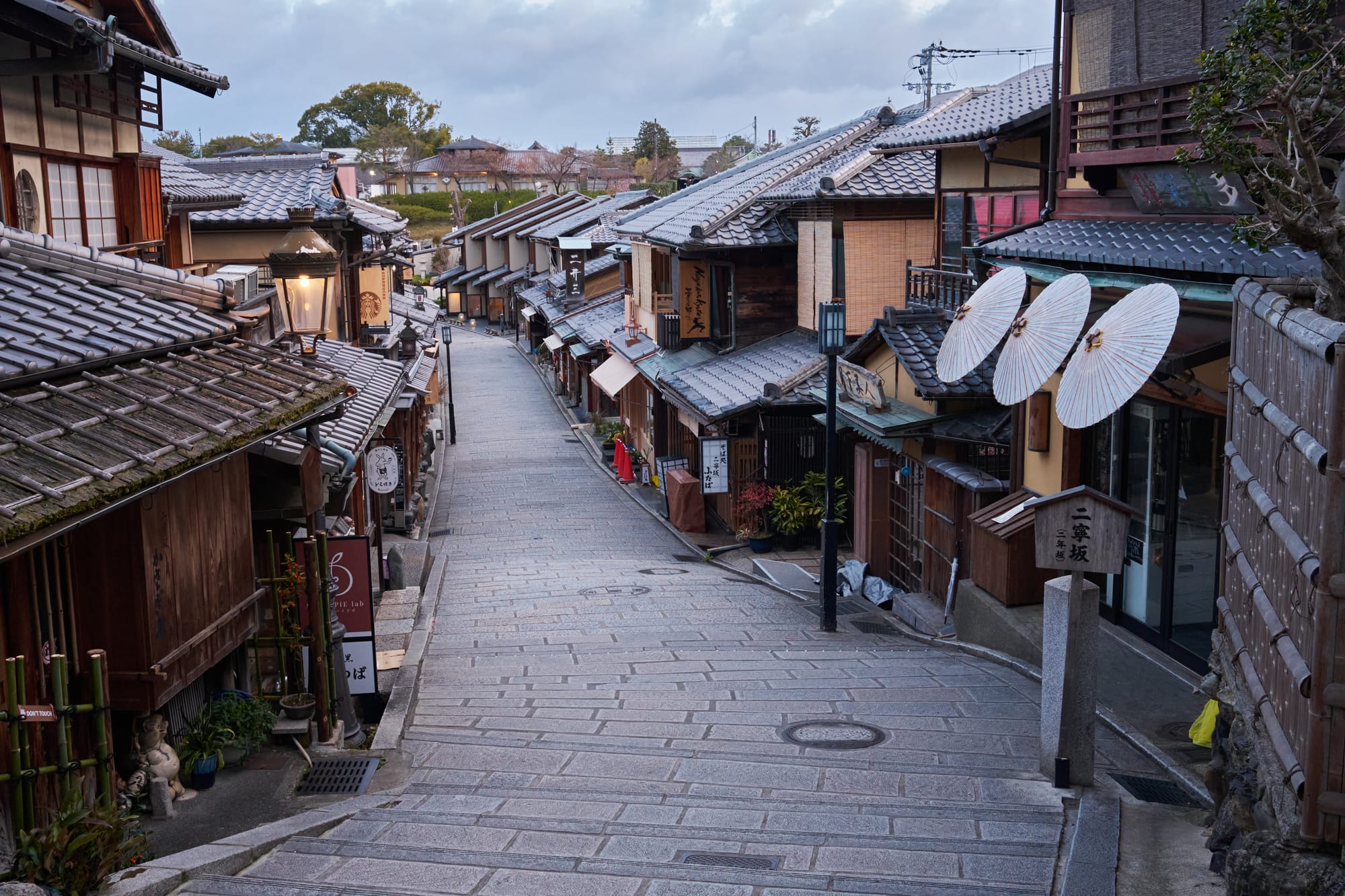 - Ninenzaka / Sannenzaka: This is a super famous picturesque walking path with traditional shops, the classic three umbrellas along the street, and a perfect view of Yasaka Tower in the distance. This ancient stone paved pedestrian street becomes completely unrecognizable in the afternoon when foot traffic surges, so be sure to come here at sunrise if you're looking for a good experience.