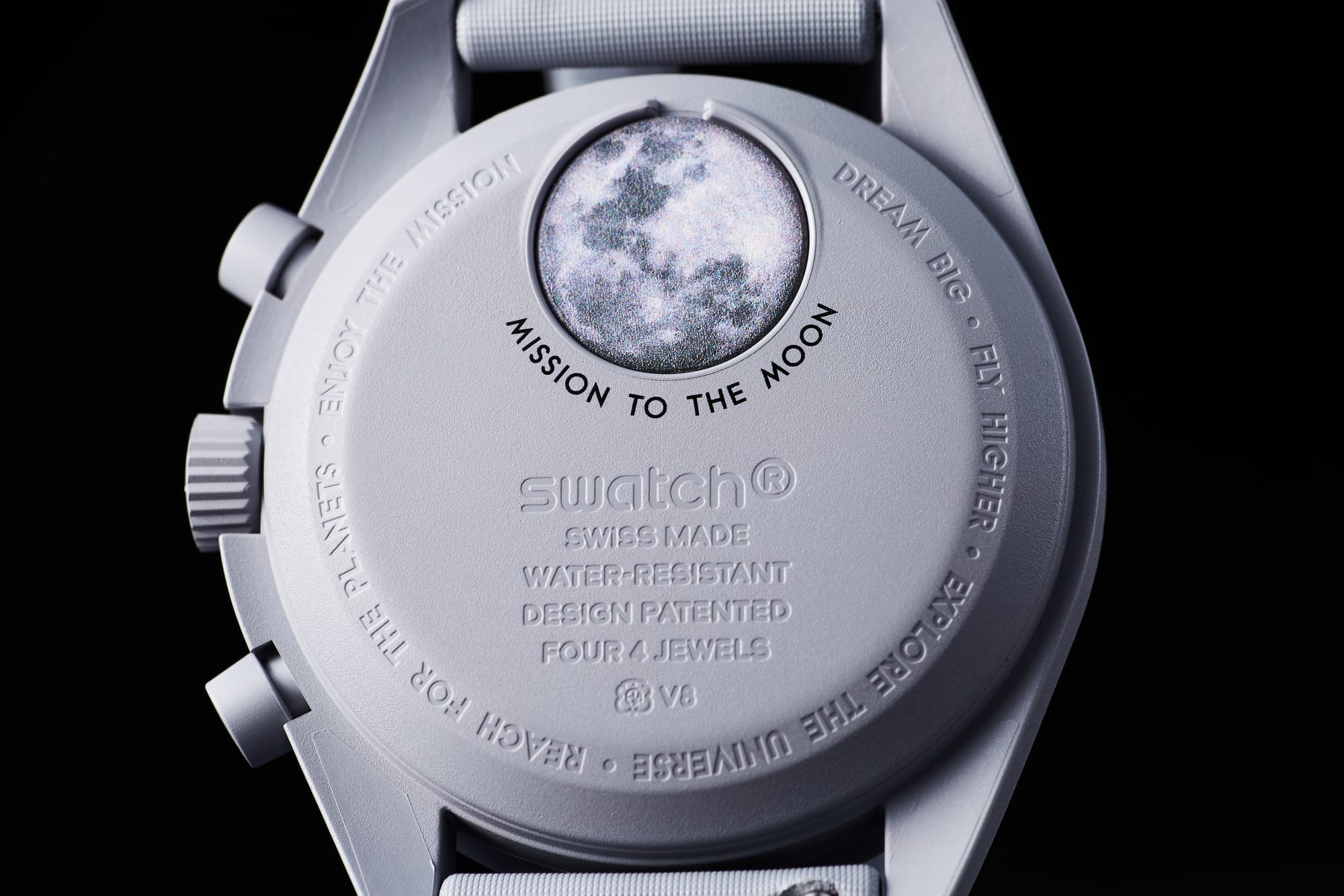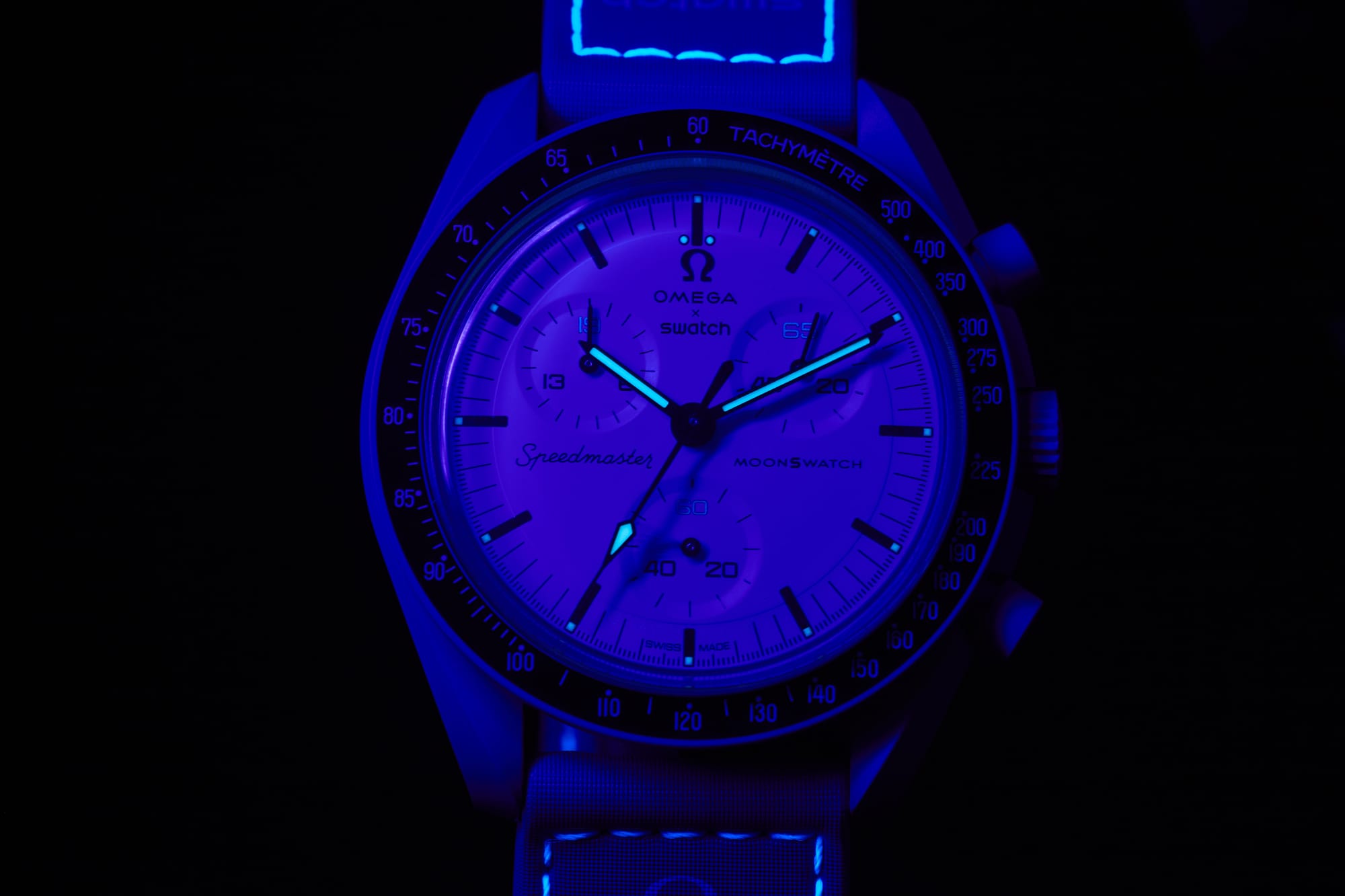 The Omega × Swatch Speedmaster MoonSwatch 1965 remains functional even when the lights go down thanks to the glow in the dark Super-LumiNova coating on the watch hands, indices, as well as the 19 and 65 numbers on the top subdials which is as useful as it is aesthetically pleasing. Additionally, one of the loveliest details on the Moonswatch 1965 is found on the back where you'll find a grainy inlay image of the moon along with the Mission To Moon mission statement engraving.