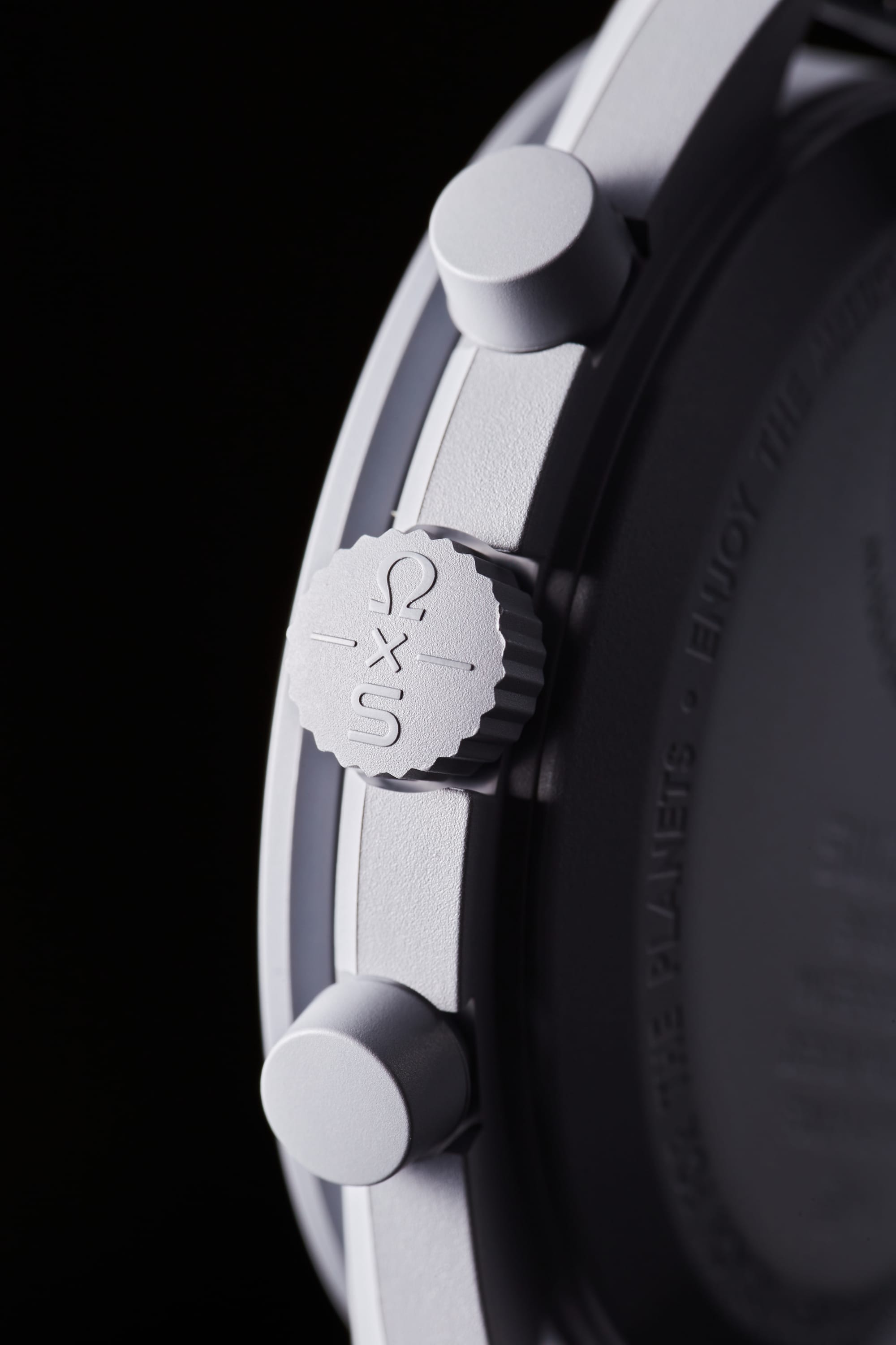 The Omega × Swatch Speedmaster MoonSwatch 1965 is dead simple with straightforward operation that makes it thoroughly enjoyable to use. The Omega x Swatch logo is embossed on the crown which is push pull design for setting the time. The top button serves as the start / stop function, while its bottom counterpart is a designated reset button.