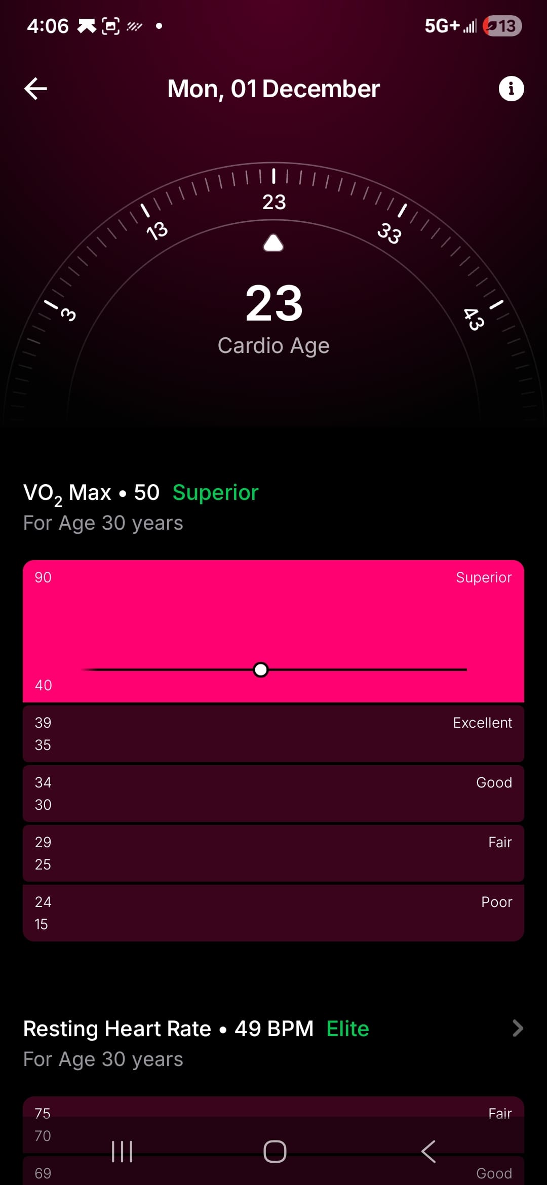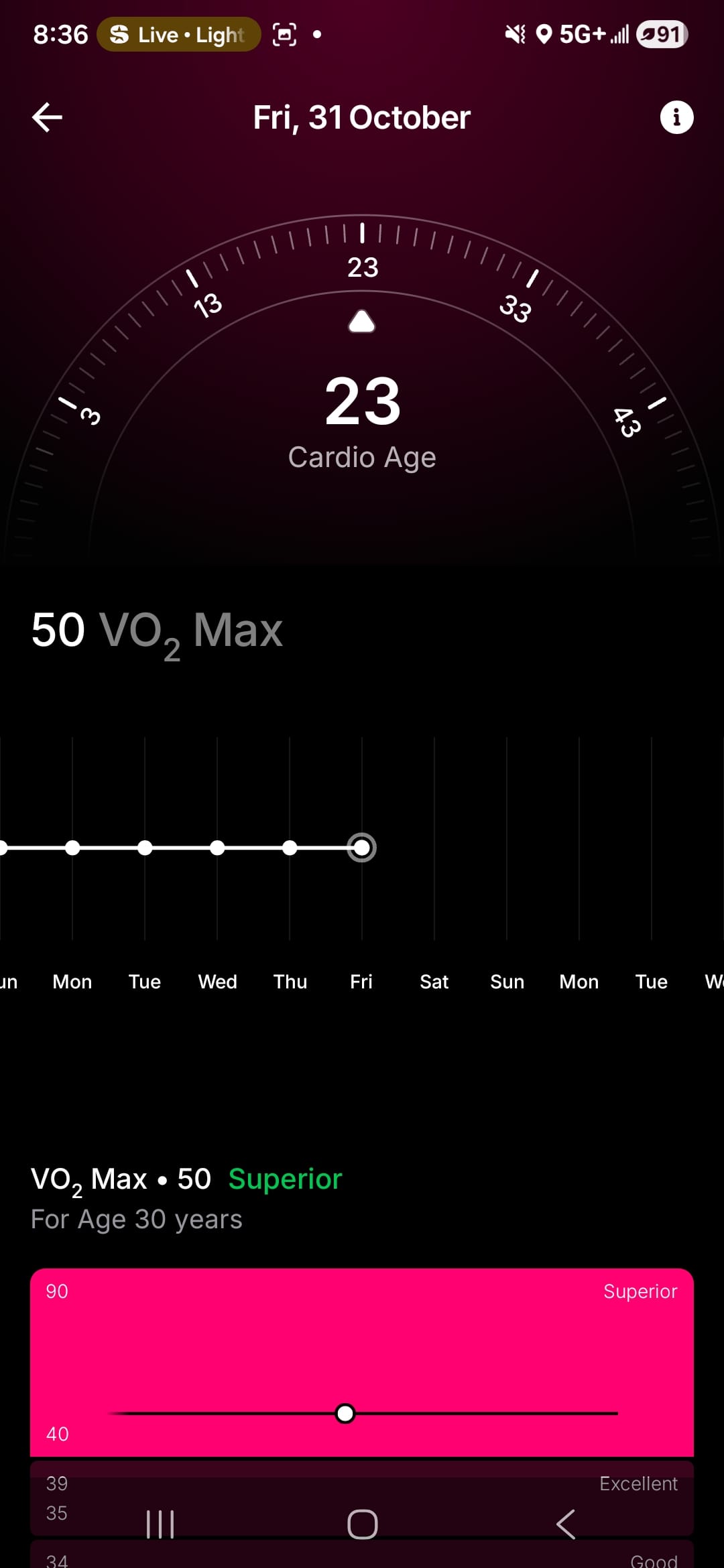 I also found the “Cardio Age” score to be particularly useful. This score tracks your VO2 max, resting heart rate, and heart rate variability to determine how efficient your heart works while exercising. The readouts are clear and show where you stand in relation to others in your age group, giving an age metric based on your heart’s performance. Maybe I like it because the cardio age it reads out to me is much lower than my actual age, which hopefully is a good indicator of cardiovascular health as I move into middle age.